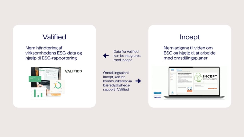 Bruger I allerede rapporteringsværktøjet Valified i jeres virksomhed, kan I nemt integrere data herfra med Incept Sustainability. Og I kan fx udarbejde jeres omstillingsplan i Incept og kommunikere den via bæredygtighedsrapporten i Valified.