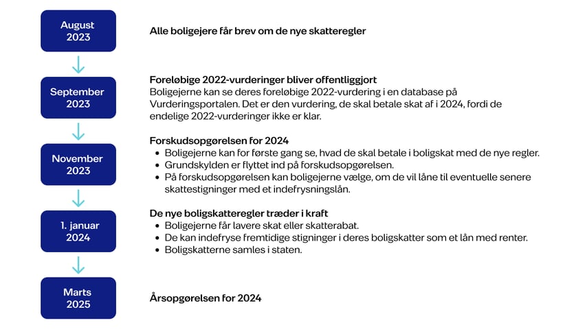Indefrysning: Oplever du, at din boligskat stiger, fordi den offentlige vurdering stiger, skal du ikke betale mere i dag. I stedet indefryses stigningen som en udskudt skat, der først skal betales den dag, hvor du sælger din bolig. Købte du bolig i 2024, og er skatten eksempelvis steget i 2027, indefryses forskellen i boligskatten mellem 2027 og 2024. På den måde er du sikret ikke at skulle have flere penge op af lommen i forhold til den dag, hvor du købte boligen. Dermed har du sikkerhed for, at den betalte boligskat ikke bliver højere, så længe du bor i boligen. Den dag du sælger, vil der så være en regning at betale.